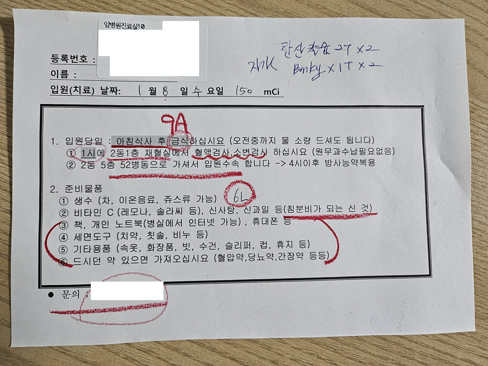 동위원소 치료가 확정되면 동시에 입원 전 검사 일정도 정해지는데 보통 동위원소 치료를 위한 입원일로부터 1주일 전으로 일정이 잡힙니다. 간호사 분이 일정안내를 주시면서 아래와 같이 준비물과 참고사항이 적힌 종이를 함께 주시니 필요하신 분들은 참고하시라고 함께 올립니다!