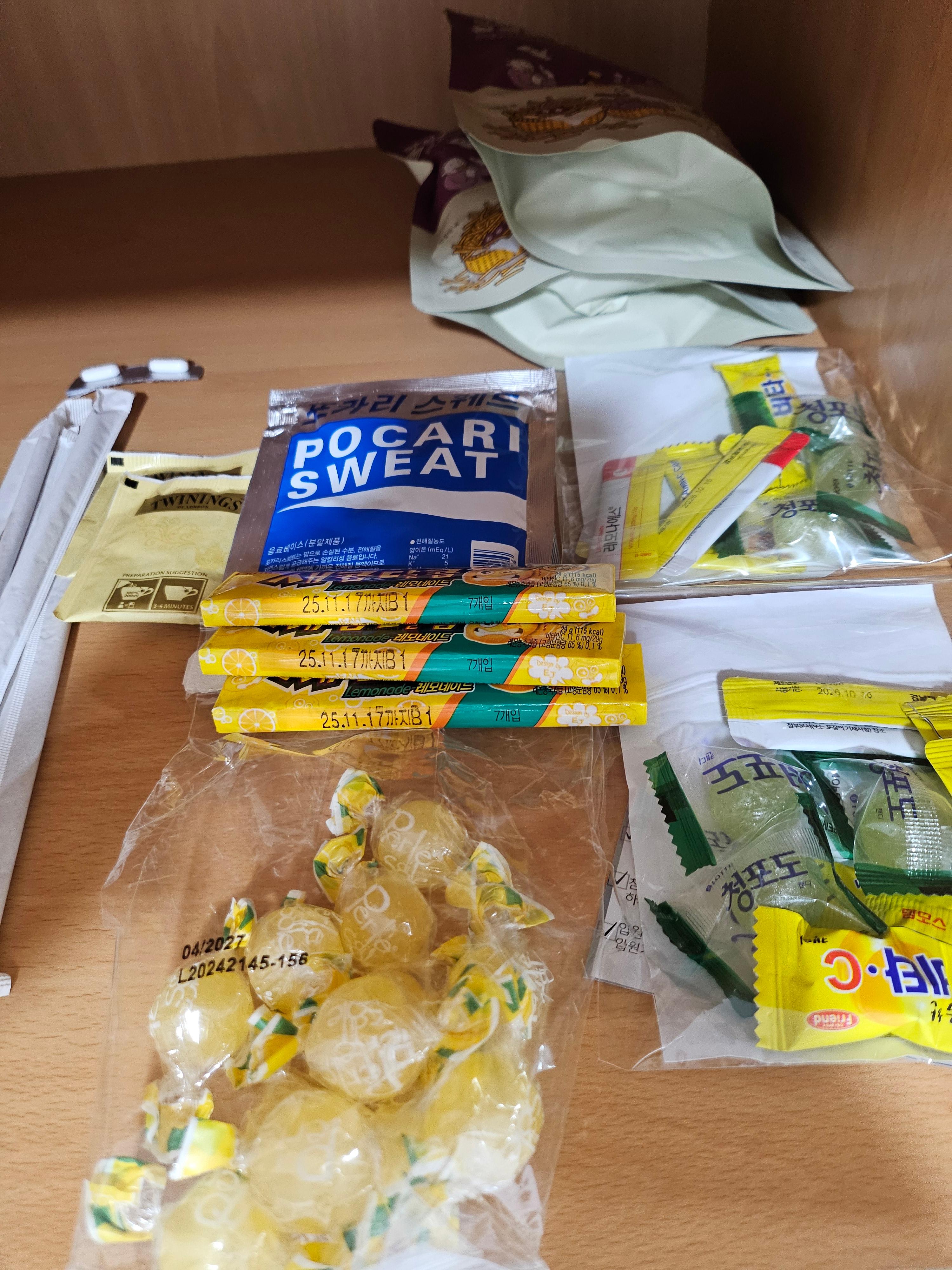 3) 간식은 많이 챙기지 않으셔도 될 것 같습니다. 1일 차에 말씀드렸 듯 아래와 같이 간식들을 챙겼는데, 제가 먹은 거라고는 새콤달콤 2통, 포지타노 캔디 4개, 나머지는 모두 자일리톨로 대체했습니다. 그 외에 챙겨간 과일, 고구마, 고구마 스틱도 활동량이 없어서인지 고구마 스틱 1봉도 다 못 먹고 버리고 왔습니다.